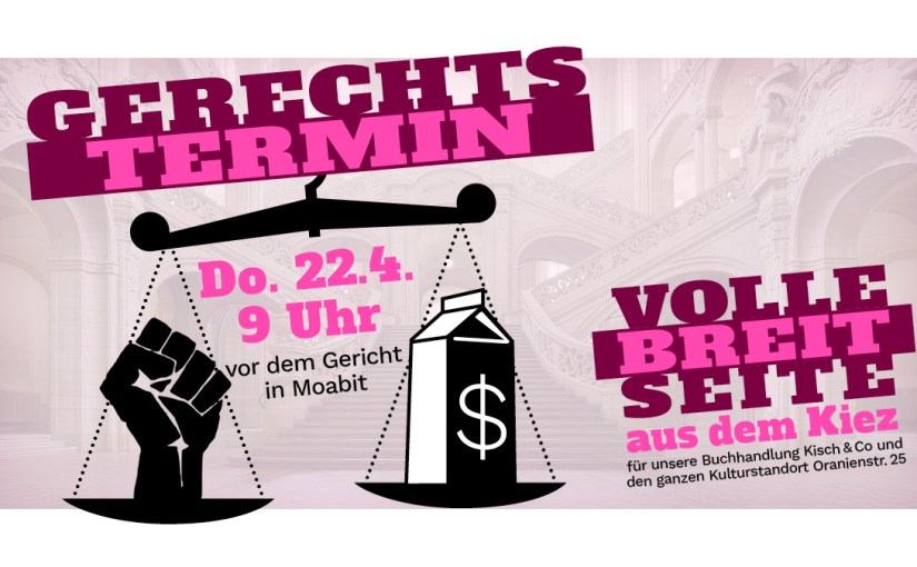 sicherlich habt ihr alle schon vom Ausgang des Räumungsklageprozesses gegen unsere Kiezbuchhandlung Kisch & Co in der Oranienstraße gehört. Dieser Zivil-Prozess fand im Kriminalgericht Moabit in einem Hochsicherheitssaal statt, der normalerweise vom Strafgericht bei Schwerstkriminalitäts- oder sog. „Terroristen“-prozessen benutzt wird. Der Verhandlungssaal ist ein riesengroßer Saal, in dem normalerweise 20 Medienvertreter und ca. 100 Zuhörer Platz finden.