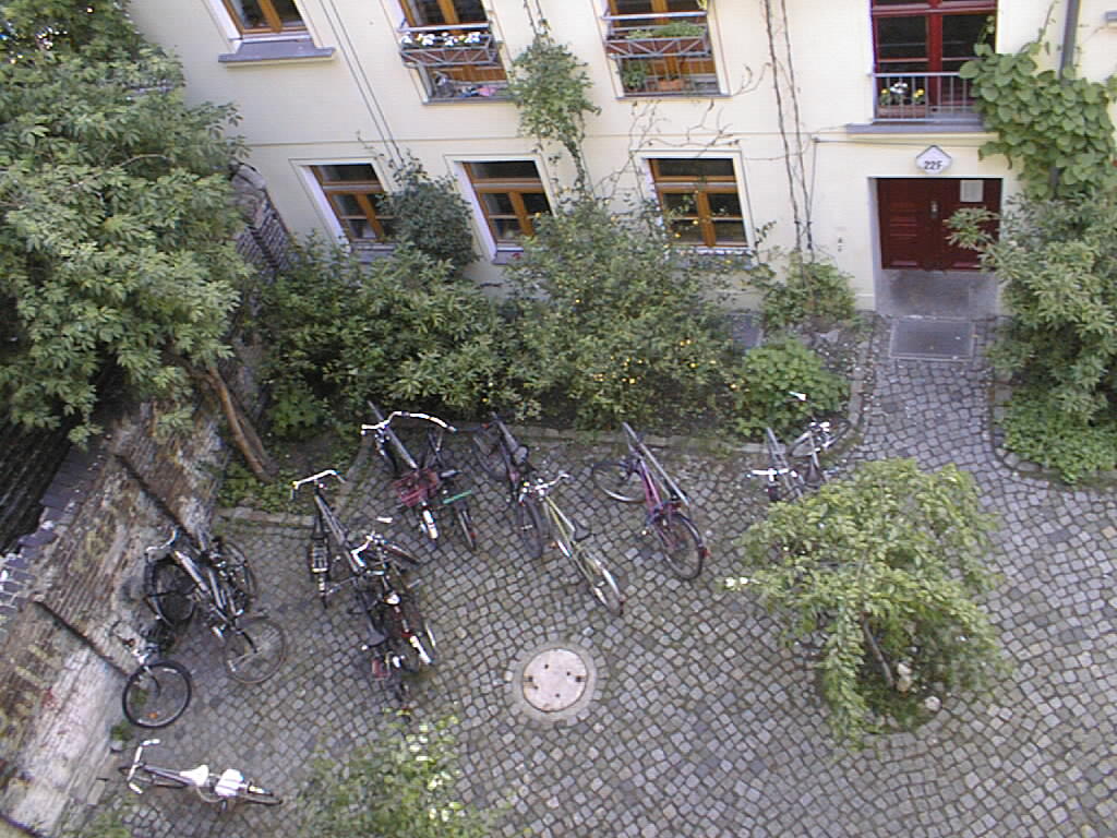 When I arrived to work the Oeko Institute in Berlin, Martin offered that we might stay a few weeks. Two weeks turned into six and a half years. The Regenbogenfabrik Haus was our foundation – we may not have stayed for so long without the nourishment of the community. This picture is looking down into the Hinterhof in front of our house. Notice the cover to the underground rainwater tank. We had to get down in there and clean out the mud.