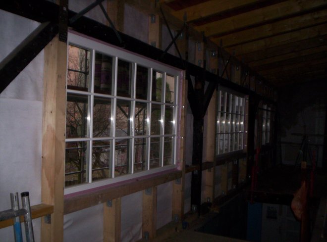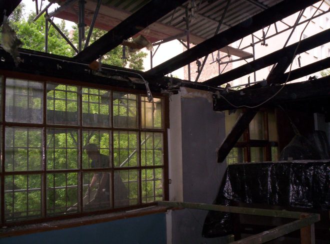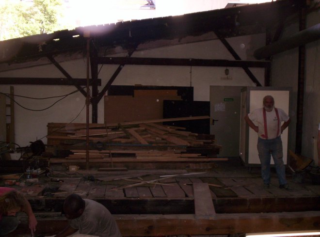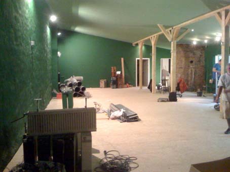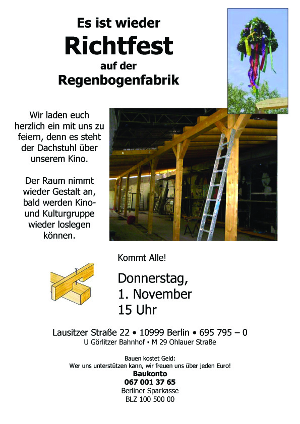 2008 schrieb die Kinogruppe: nun müsst Ihr schon so lange auf uns verzichten. Aber, uns gibt es noch und es wird im Kinoraum und auf der RegenbogenFabrik tüchtig gebaut. Aber wie das Wesen des Films darin zu finden ist, dass ein Bild von einem weiteren Bild abgelöst wird, so besteht das Wesen des Bauens wohl darin, dass es sich hinzieht und hinzieht. Dass sich bei der kompletten Erneuerung des Daches die Bodenbalken als morsch erwiesen, der Quarzsand statt in Portionensäcken lose tonnenweise auf die Fabrik geliefert worden ist und sich so das eine Gewerk immer auf das nächste verschoben hat, von all diesen baulichen Widrigkeiten will ich Euch hier gar nicht klagen. Sondern lieber Euch mitteilen, dass es voran geht und unser RegenbogenKino sehr schön wird. Dazu ein paar Impressionen: