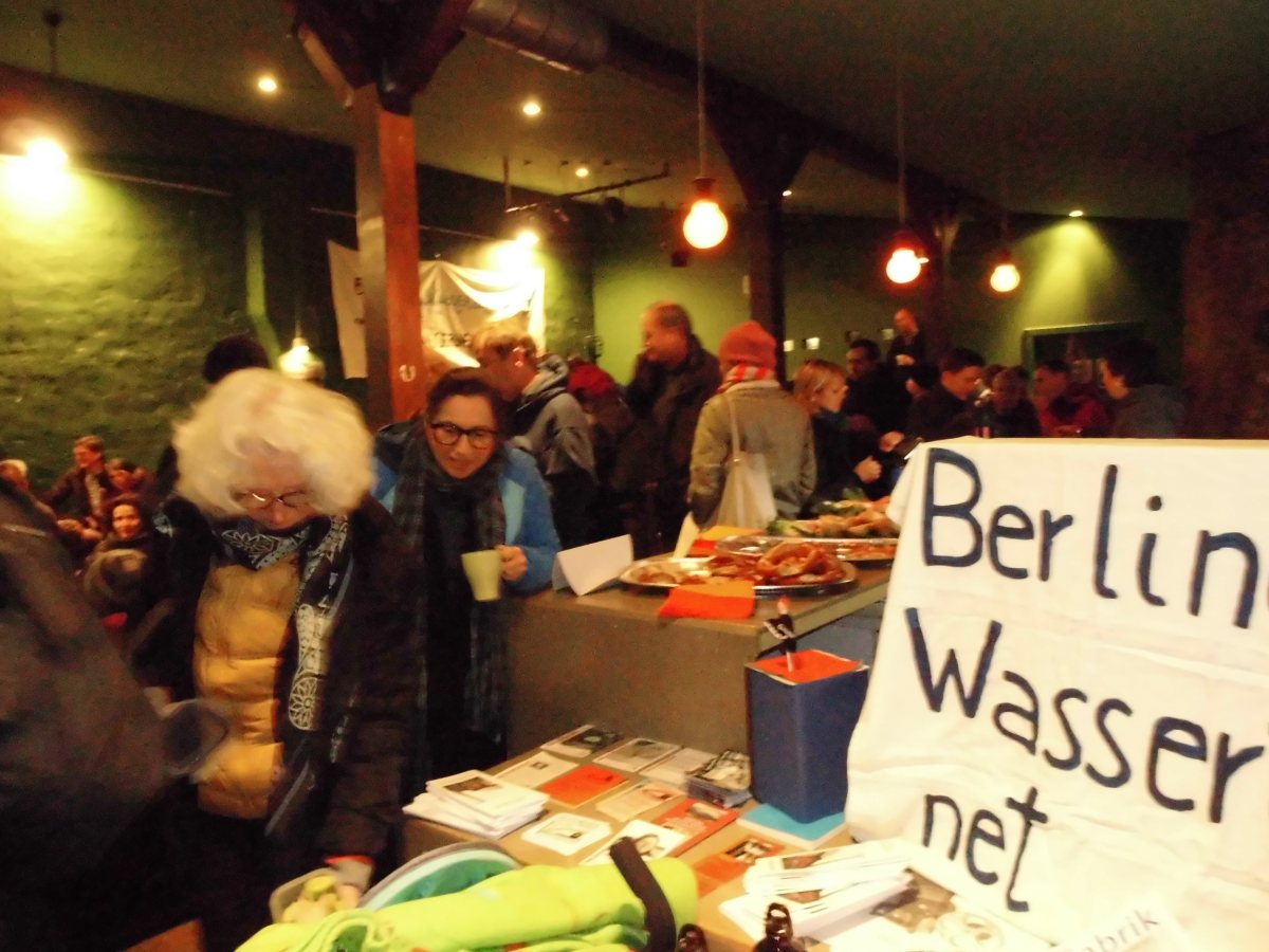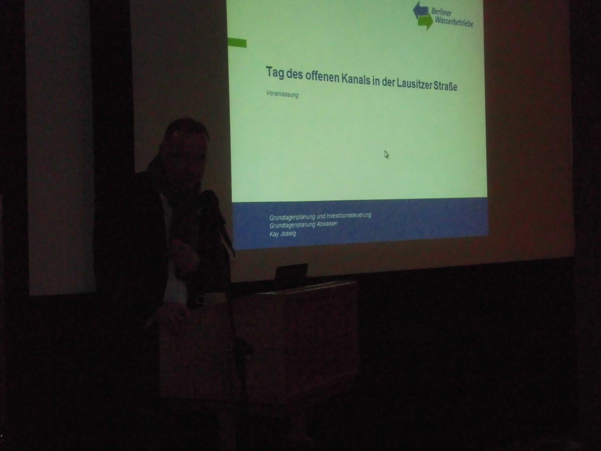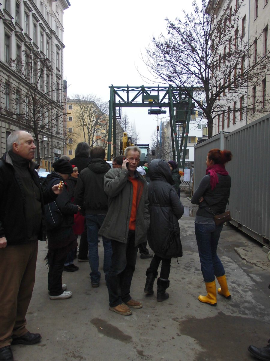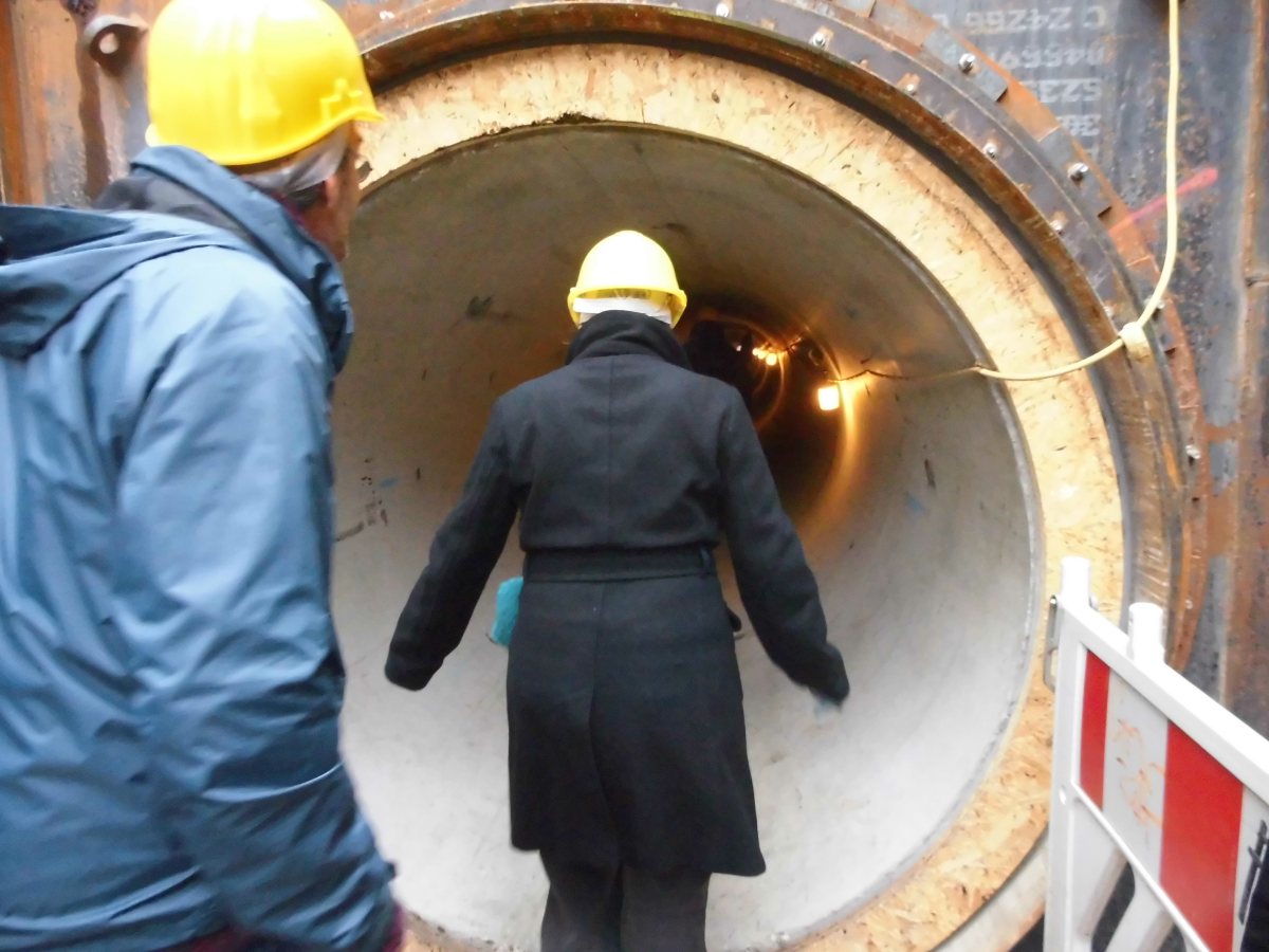 Am 30.4. trafen sich Nachbar*innen und Aktivist*innen vom Landwerkanal und bereiteten sich auf die dann doch hektisch von den BWB angesetzte Informationsveranstaltung vor. So kam es zu einer Anwohner*innenversammlung am 8. Mai 2013 im RegenbogenKino, wo fachkundig andere Baumöglichkeiten vorgestellt wurden. Und siehe da: Schon am 22. Mai gab es eine 2. Veranstaltung mit den BWB zu den Baumaßnahmen in der Lausitzer Straße. Überraschenderweise lenkten die BWB ein und sprachen sich nun für ein unterirdisches Verfahren aus. In der Lausitzer Straße musste nun nur noch ein Baum gefällt werden. Es war möglich, das Bauvorhaben per Tunnelbau durchzuführen. Die durchführende Baufirma fürchtete die Bewohner*innen des kampferprobten gallischen Dorfes Kreuzberg, der Regenbogenfabrik und ihrer Nachbarschaft. Und gegen Menschen wollte die Baufirma nicht vorgehen und damit schlechte Nachrichten in der Öffentlichkeit verursachen. Fünf weitere Bäume direkt am Landwehrkanal konnten aber nicht gerettet werden, dort entstand das eigentliche Auffangbecken. Lange fünf Monate war die Baustelle dennoch groß und abschreckend genug, doch am 14. Dezember war alles soweit fertig. Die Wasserbetriebe sprachen nach einer dritten Anwohner*innenversammlung das Angebot an alle Interessierten aus, durch die Röhre zu laufen. Das wurde von vielen angenommen. Wann kommt mensch sonst so einfach in die Unterwelt.