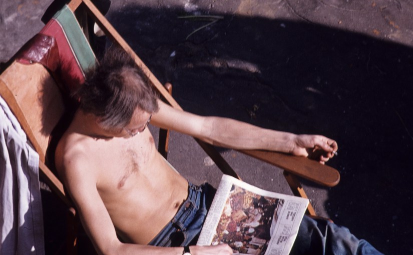 Fragen, die uns heute weit weg erscheinen und doch wieder neu gestellt werden. Aber das ist jetzt ein Nebenschauspiel, wichtig, aber eine Ablenkung davon, dass es darum geht, einen alten Mitstreiter aus der Besetzerzeit zu würdigen. Und dann gibt es doch nur ganz kleine Erinnerungsschnipsel. Helmut im Liegestuhl mit der taz, super typisch das Bild. Helmut vor dem Café mit Achim und Heinz, den Austausch genießend. Helmut in der Menge der Zuschauer beim türkischen Theaterstück im Regenbogenhof.