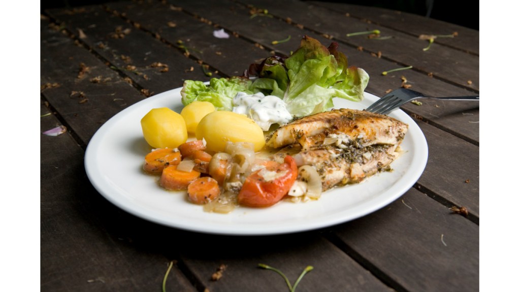 5. Den Fisch zusammen mit Gemüse, Salzkartoffeln und Remoulade servieren.