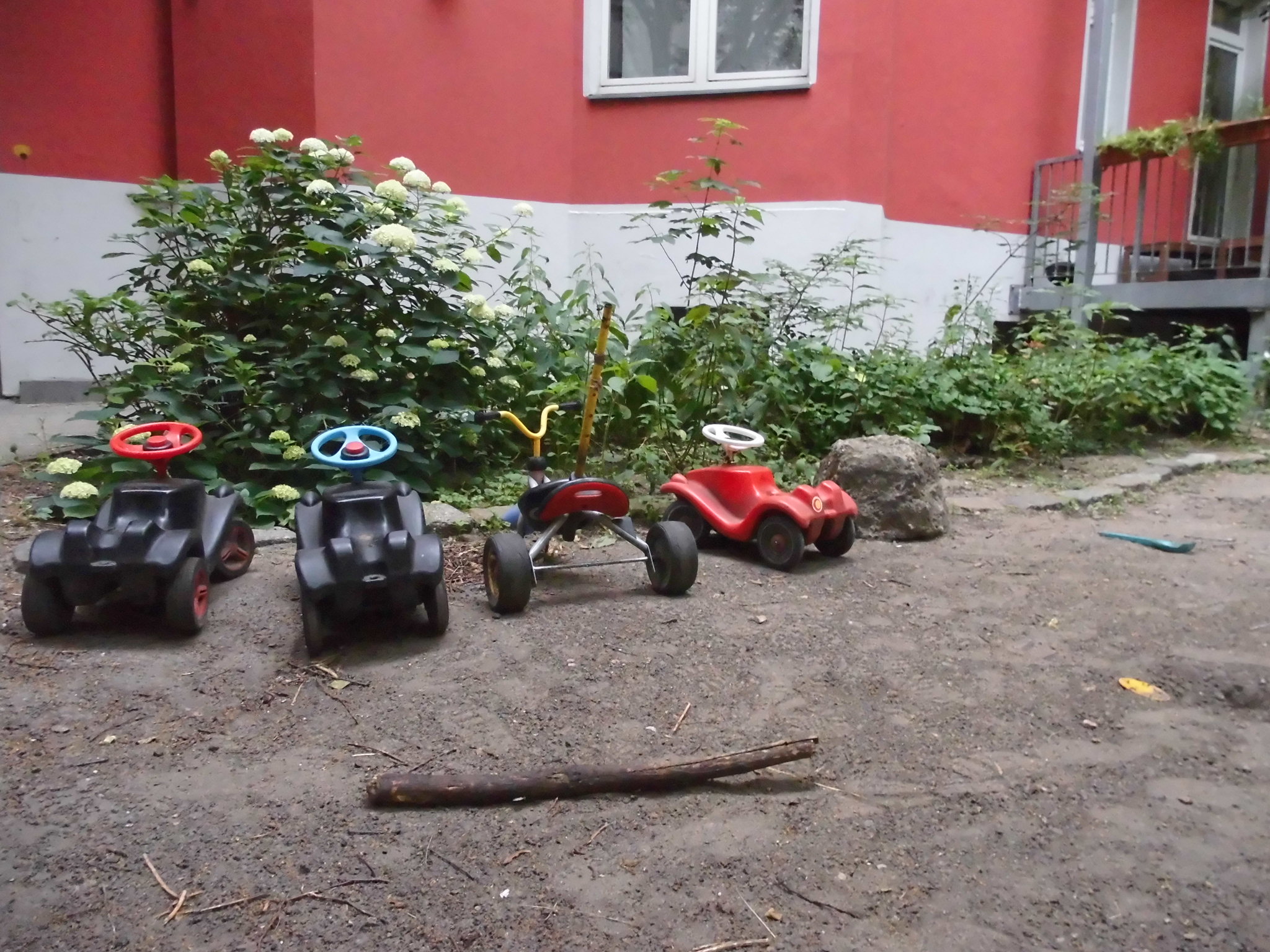Irgendwann haben wir für Mara neben der Schaukel den ersten Sandkasten ausgehoben. Um nicht völlig auf dem Präsentierteller zu sitzen, kamen Pflanzen dazu – geschenkt, aus dem Wald geklaut, vom Pflanzenbasar. Die wenigsten haben Schatten, Bauschutt, Trockenheit – der Wasseranschluss wurde vom Hausmeister stillgelegt, da könnte ja jeder kommen – und heranwachsende Rabauken – Ups, stand da was? – überlebt. Ein Bambus vom Holländer – seid ihr verrückt, den kriegt ihr nie wieder weg – machte den Anfang als Überlebenskünstler. Inzwischen haben es einige geschafft und weitere Hobbygärtner sind eingestiegen. Kurz: Es ist ganz schön grün geworden. Oder wie es einer aus dem zweiten Hinterhaus formulierte: „Ganz schön spießig, oder?“
