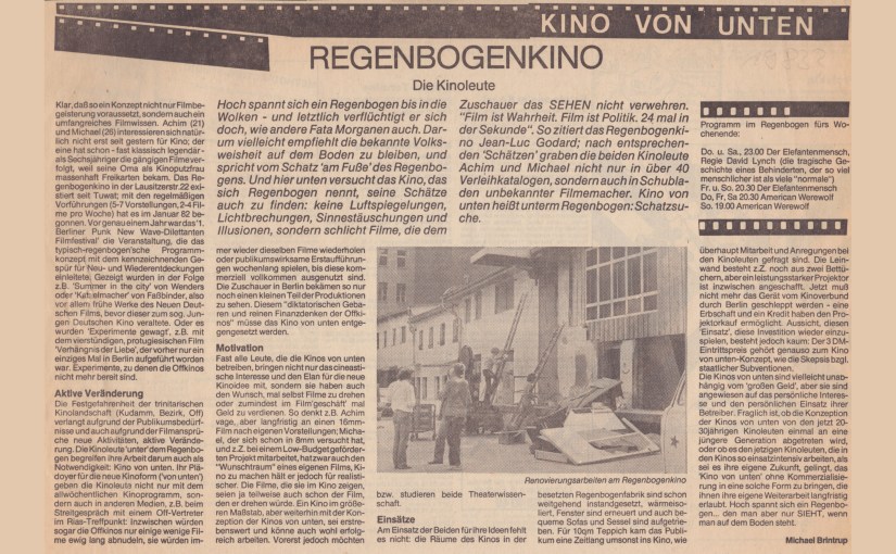 So beginnt ein Portrait des RegenbogenKinos, geschrieben von Michael Brintrup. Es ist wohl in der taz veröffentlicht worden, doch das können wir nur erraten; der Artikel ist feinsäuberlich ausgeschnitten und dabei ‚zeitlos‘ geworden. Wir tippen auf das Jahr 1982.