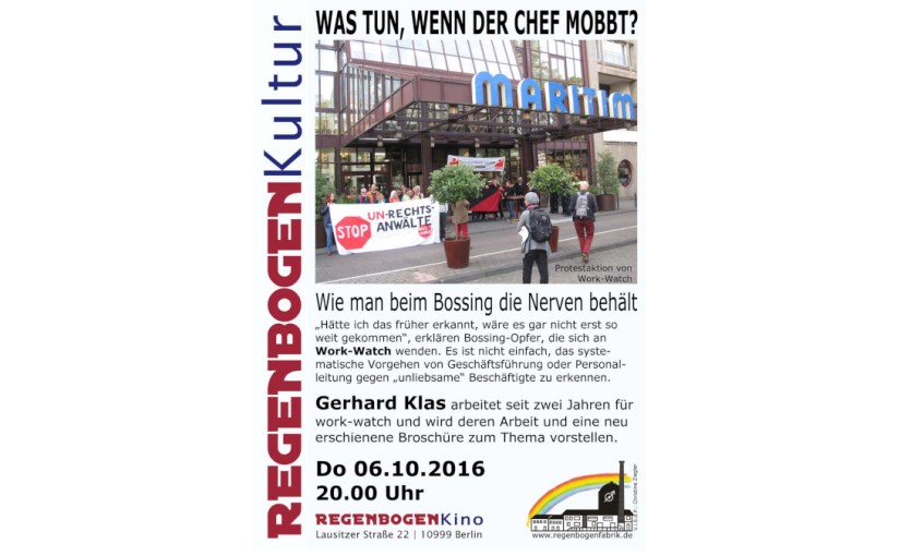 work watch ist ein eingetragener Verein, der 2012 gegründet wurde. Die Aktivist:innen beraten und unterstützen Betriebsratsgremien und engagierte Mitarbeiter:innen, die von ihren Vorgesetzten systematisch mit bewusst gestreuten Gerüchten, fragwürdigen Abmahnungen, haltlosen Kündigungen, Androhung von Regressforderungen, Erpressung und manchmal auch mit dem Einsatz von Detektiven drangsaliert werden. Spenden sind immer willkommen!