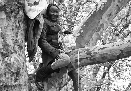 Nach der Räumung des Flüchtlingscamps am Oranienplatz am 8. April 2014 bleiben einige Geflüchtete – darunter Napuli Paul Langa. Die sudanesische Aktivistin harrt über fünf Tage auf einem Baum aus – trotz Wind und Wetter. Sie steht dafür, dass der Senat – anders als er es darstellt – keine Einigung mit den Flüchtlingen erreicht hat; dafür, dass der Protest weitergehen soll.