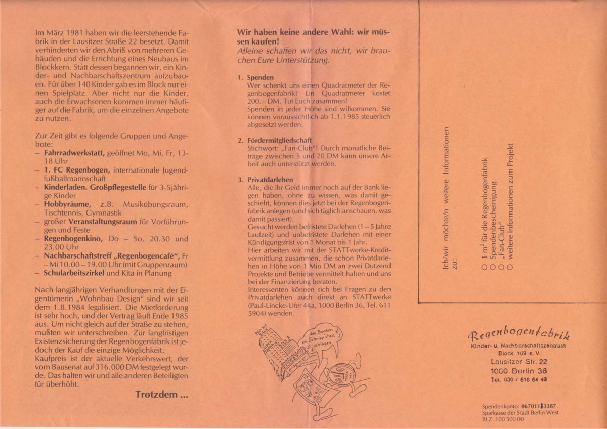 So sah also das erste Fundraising der Regenbogenfabrik aus. Tja, 316.000 DM, mit Kaufnebenkosten etwa 330.000 DM, das kam uns damals vor wie viel Geld. Was wäre uns erspart geblieben, wenn wir damals den Kauf wirklich durchgeführt hätten? Was wäre stattdessen schräg gelaufen? Wer weiß. Auf jeden Fall wurden die Pläne zurückgestellt, da der Senat seinen Kaufbeschluss verkündet hatte. Bekanntermaßen wurde dann erst in den 90er Jahren gekauft.