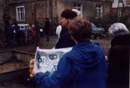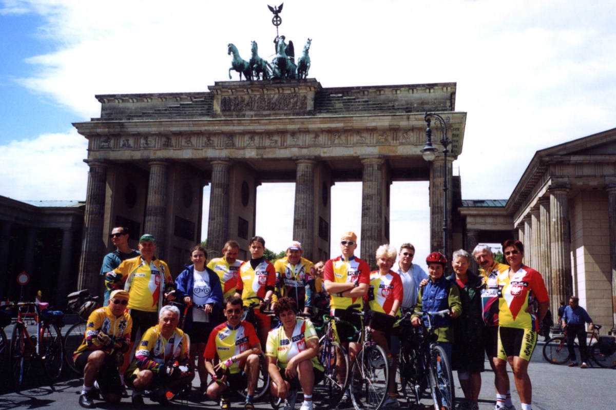 Zu diesen Zeiten war der Fotoapparat nicht gleich zur Hand, es gibt von dem – aus heutiger Sicht denkwürdigen Treffen – keine Fotos. Auch sonst enthält die digitale Bilderkiste eher wenige Fotos aus dem letzten Jahrtausend. Der erste Fund zeigt einen Infostand im Jahr 1998, die „Kreuzberger Tage in Stettin“ sollten da im Schlosshof stattfinden. Wolkenbrüche vertrieben uns ins Schlossinnere und wir blieben erst mal noch unter uns. Das gelbe Plakat aus dem Jahr 2000 kündet von einer Ausstellung in Stettin-Turzyn über Grüne Höfe in Kreuzberg. Das ist der Startpunkt für eine wunderbare Serie von Aktivitäten rund um das Thema Hofbegrünung und legt den Grundstein für die intensive Zusammenarbeit mit dem Siedlungsrat dieses Stadtteils. Doch los ging es damit erst später. Erst kamen die Radfahrerinnen in der Begegnung zum Zuge. Dafür gabs einen naheliegenden Grund: Der erste, der systematisch für die Städtepartnerschaft gearbeitet hat – und das noch vor Gründung des Vereins – war Aloys Ebner. Er hatte am Osteuropainstitut der FU studiert und war darüber hinaus ein leidenschaftlicher Radfahrer und Zweiradmechaniker.