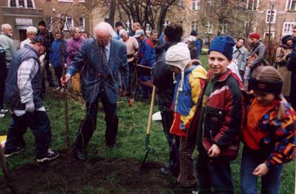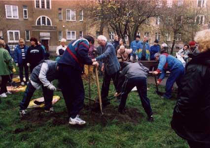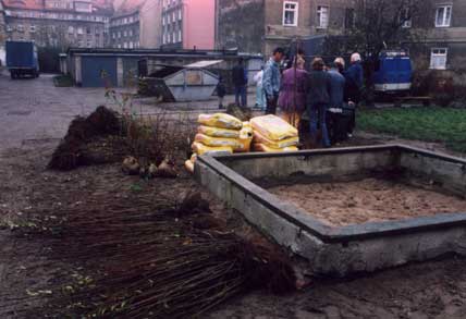 Am 16. November 2002 konnte die Kreuzberger Delegation dann im Rahmen eines Arbeitsbesuchs 12 Bäume, rd. 550 Sträucher, sowie zwei Bänke an die Bewohner:innen übergeben. Über 50 Anwohner:innen beteiligten sich aktiv an der Pflanzaktion. Später wurde berichtet, dass mit dem so verschönerten Hof sorgfältig umgegangen wird und eine Gruppe von Bewohnern schon weitergehende Pläne (Beseitigung von Garagen und Stellplätzen und deren Begrünung) entwickelt und die Bewohner anderer Höfe nachfragen, ob ihre Höfe auch so umgestaltet werden können. So ist es dann auch mehrfach geschehen.“ Aus dem Jahresbericht des Vereins