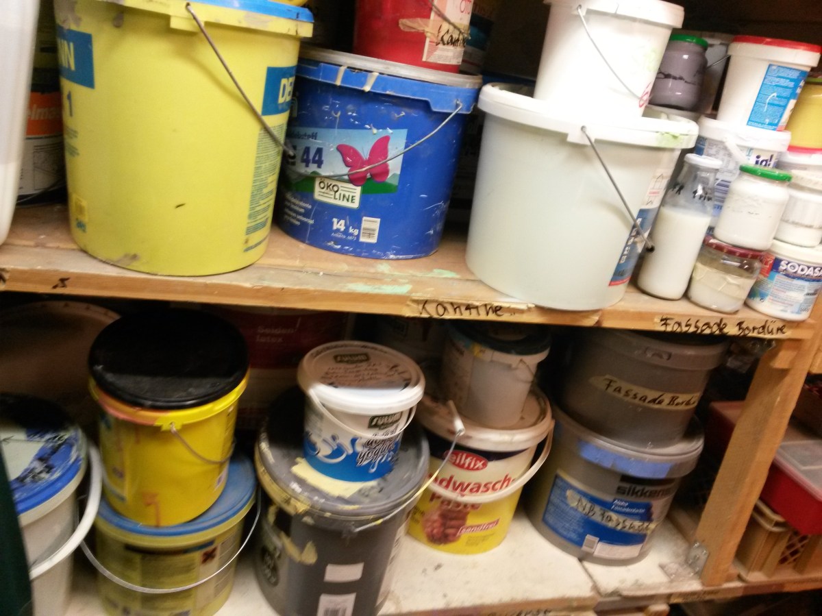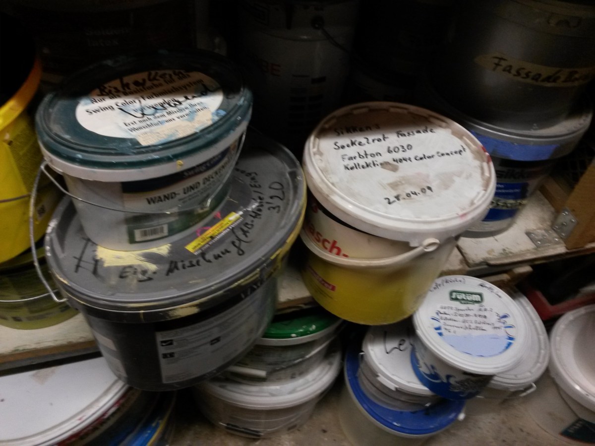 So ist der Keller zugestellt mit Farbeimern aller Gruppen (!), fein säuberlich beschriftet mit Bereich und Jahr. Denn Ausbesserungen mit Farben aus Selbstmischungen sind eine besondere Herausforderung.