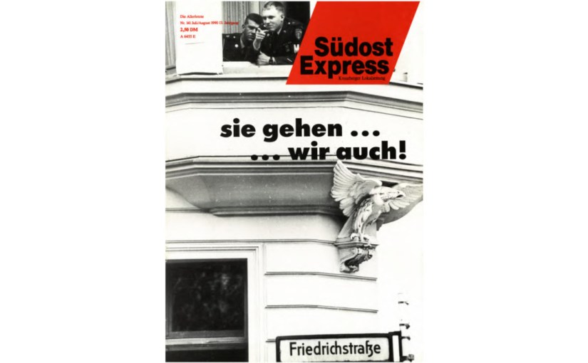 »Sie gehen … – wir auch!« So stand es auf dem Titel der »Allerletzten« Ausgabe des Südost Express, der Nr.141 vom Juli 1990. Damit verabschiedete sich die wohl erfolgreichste »Kreuzberger Lokalzeitung« von ihren Lesern. Das Titelbild zeigt zwei amerikanische Soldaten, die wenige Monate nach dem Fall der Mauer von einem Fenster am Checkpoint Charlie aus einen vermeintlich letzten Blick in den einst feindlichen Osten werfen.