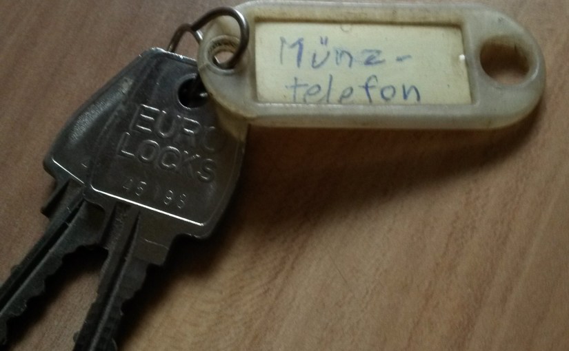 Beim neusten Versuch, einen Überblick über das immerwährende Schlüsselchaos zu bekommen, ist uns ein Schlüssel mit der Aufschrift „Münztelefon“ in die Hände gefallen: