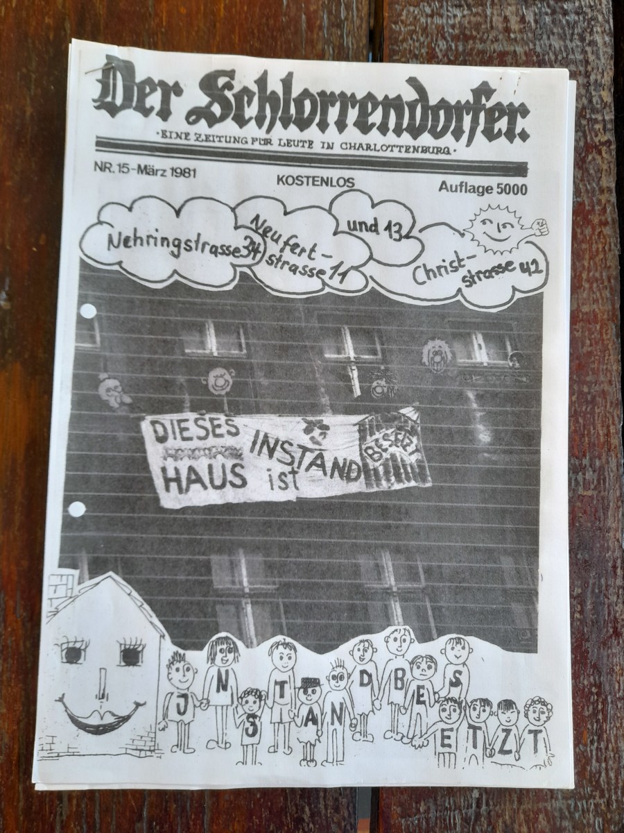 DIE TAZ berichtete, aber vor allem die Szenezeitung „Der Schlorrendorfer“ – Auflage satte 5.000 Exemplare… Sie widmete der ersten Hausbesetzung in Charlottenburg gleich zwei Extrablätter. Sie wurden kostenlos in und um den Kiez verteilt, u.a. um der damals üblichen Diffamierung der Besetzerszene durch die Springerpresse, allen voran der BZ, die Spitze zu nehmen.
