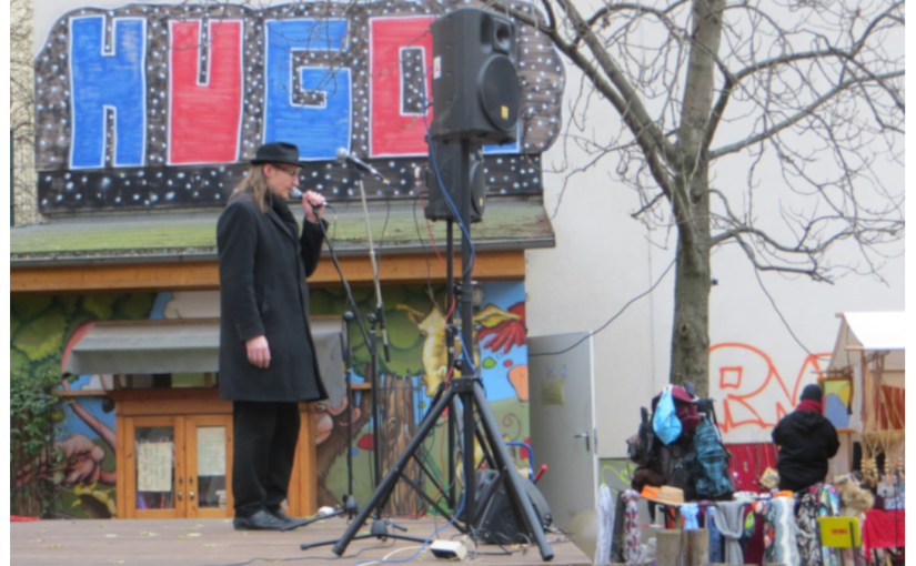 Das Bild entstand in Vorbereitung auf ein Hoffest, im Hintergrund wird schon alles für den Trödelstand sortiert. Der warme Mantel des Technikers deutet drauf hin, dass es wohl ein Winterbasar war.