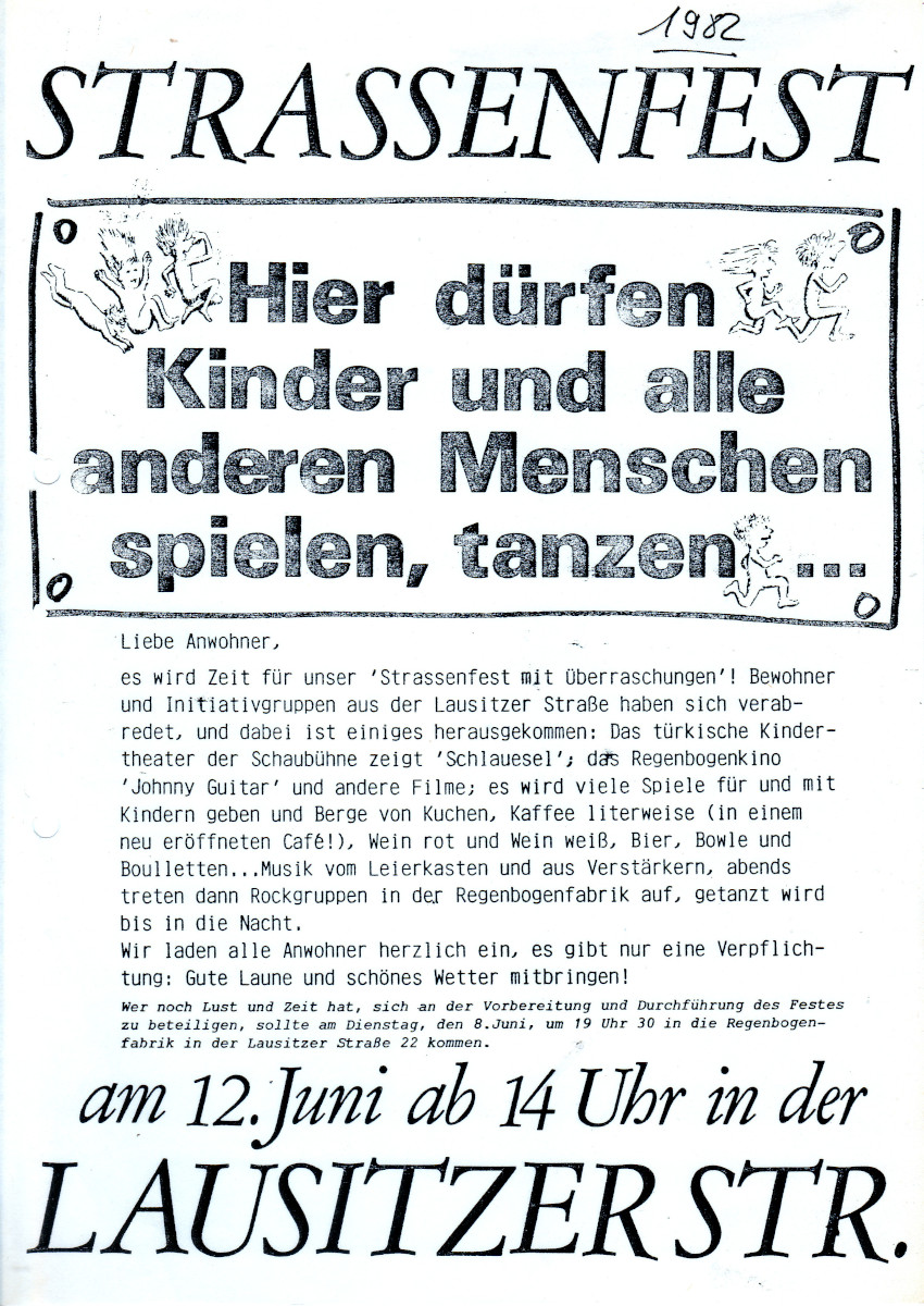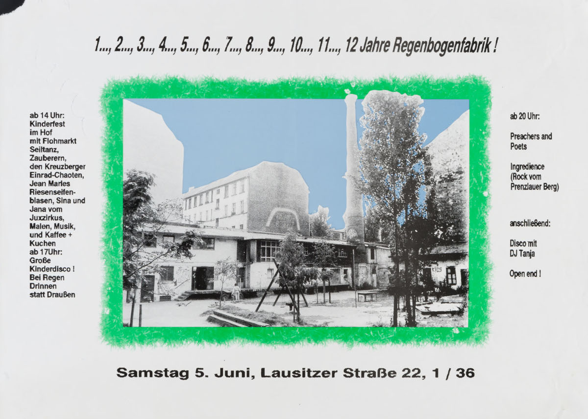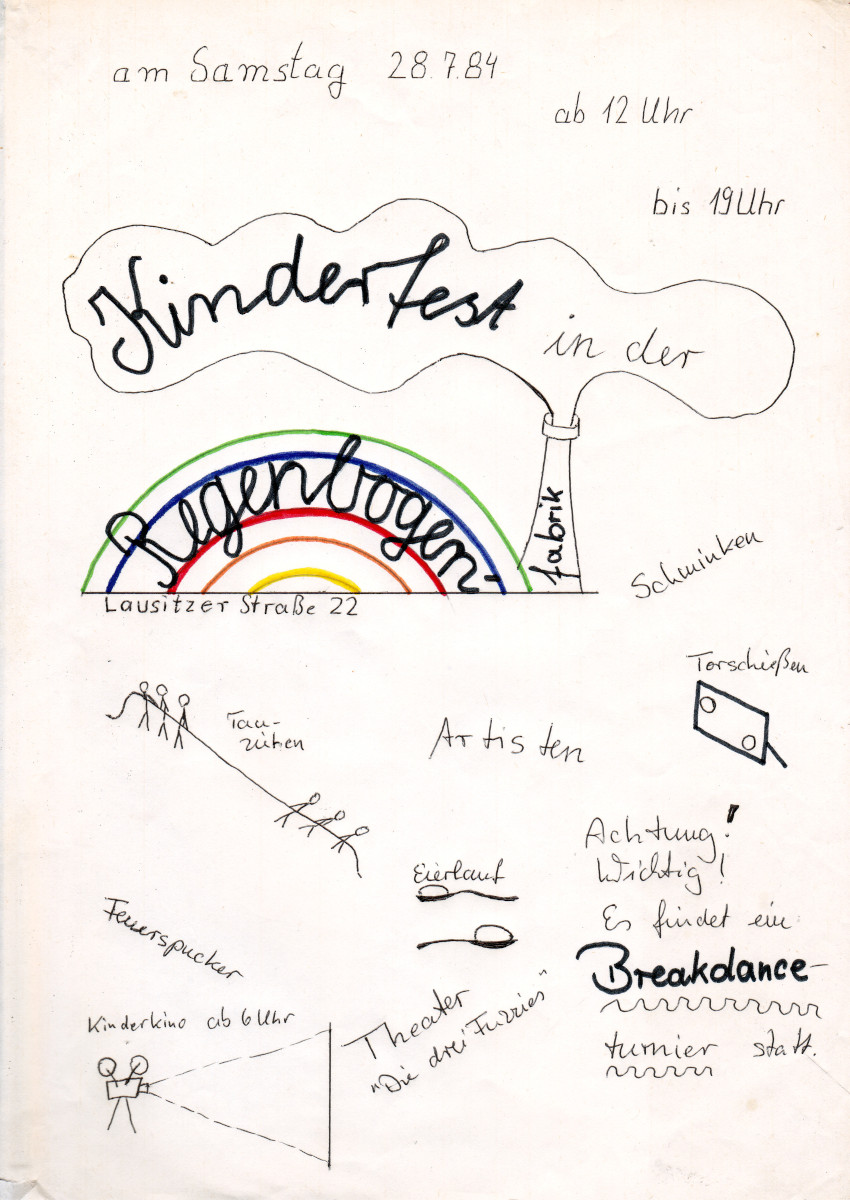 Alles wandelt sich, nichts bleibt. Und das scheint uns auch ganz und gar sichtbar in den Plakaten und Einladungen zu den Festen der Fabrik. Wir haben sie mal nach jeweils zehn Jahren gruppiert. Erst haben wir nach den Jubiläumsparties Ausschau gehalten, doch da gab es nicht immer ein Fest. Gewiss aus ganz verschiedenen Gründen. Für die erste Dekade, für die die Erinnerung schon dünn ist, kann auch angenommen werden, dass die Plakate alle als Schmierpapier geendet sind. Vielmals reichte wohl auch eine Anzeige in der taz oder im Südost Express. Und sobald die Musik zu hören war, sind die Kinder sowieso gekommen.