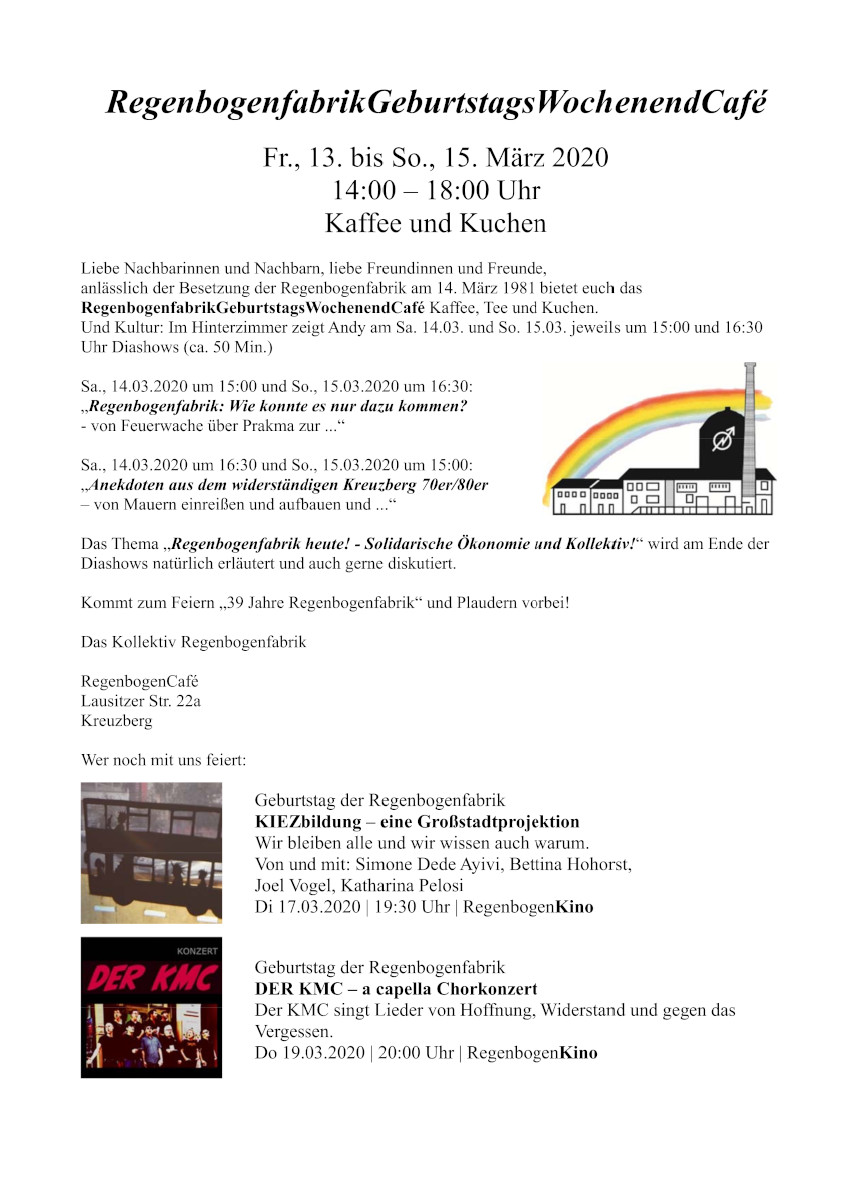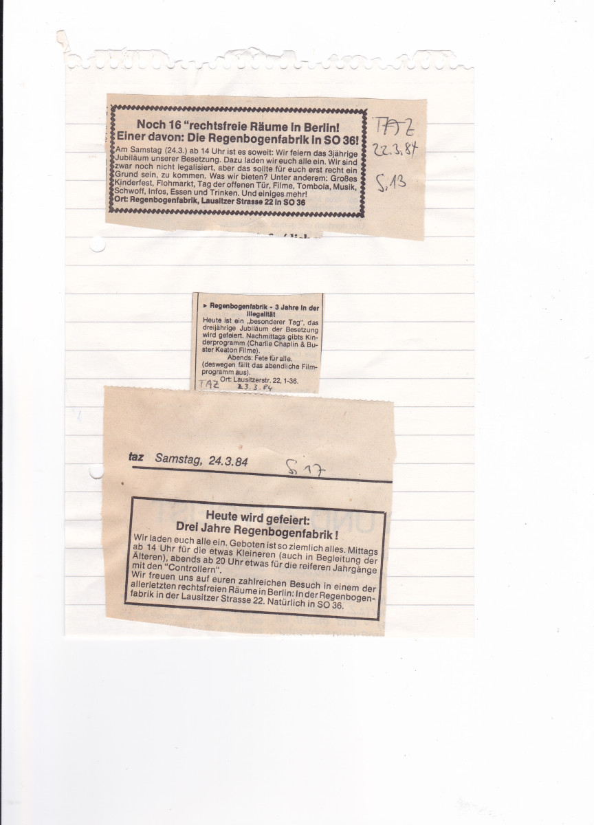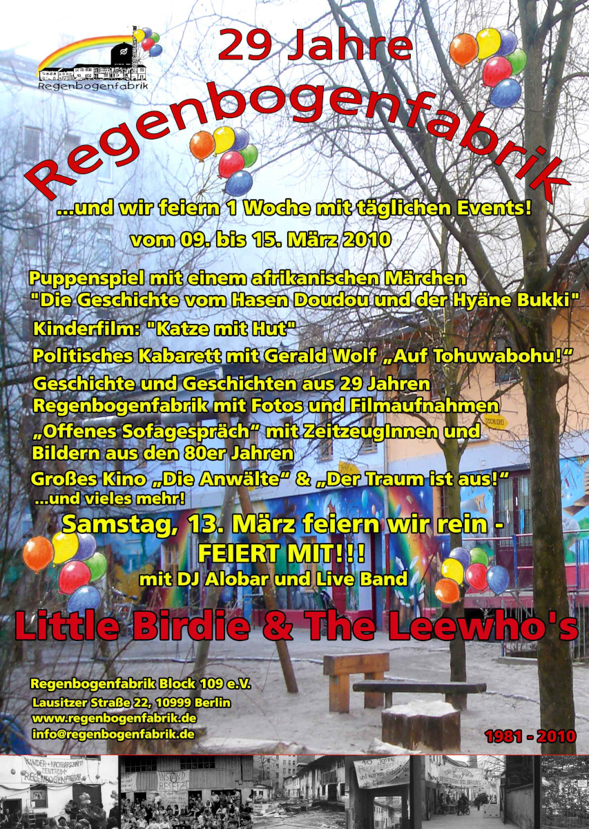 Und hier die zweite Dekade, nicht immer zum Geburtstag; da scheint uns nach all den Anstrengungen der Wiederbesetzung das Feiern doch mal vergangen zu sein. Doch dann hat es die Feier zur Volljährigkeit der Fabrik wieder rausgerissen.