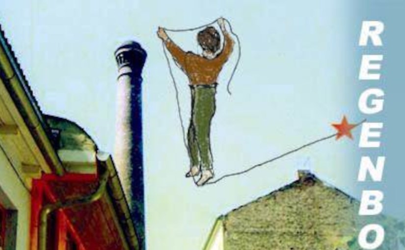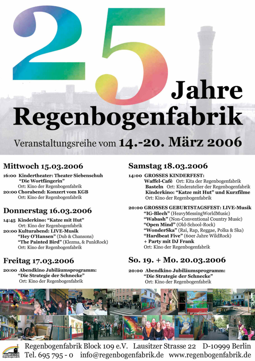 In der dritten Dekade setzt sich bei der Gestaltung offensichtlich zunehmend die Arbeit am Computer durch. Das Sommerfest ist hier stellvertretend für eine längere Reihe „RegenbogenKONZERTE“. Da waren alle Plakate streng in schwarz-weiß gehalten. Die Einladung zum Richtfest ist auch ein Indiz dafür, dass die großen Feiern nicht dran waren, statt dessen alle Gelegenheiten wie eben ein Richtfest genutzt wurden, um die Freund:innen der Regenbogenfabrik zusammenzubringen.