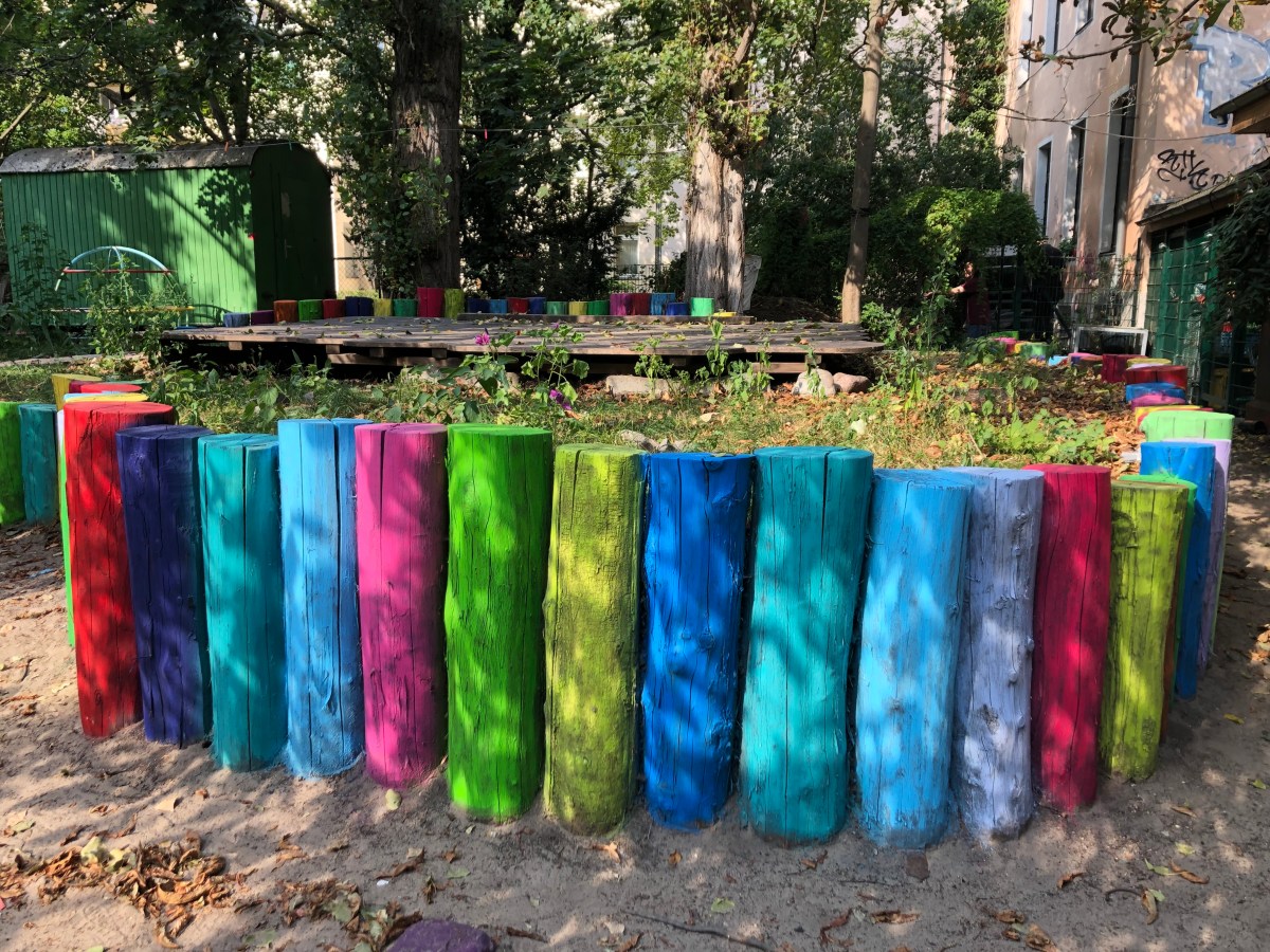Es folgten die Palisaden des Kulturhügels. Die waren im Frühjahr 2023 fertiggestellt worden. https://regenbogenfabrik40.blog/2023/05/26/hipp-hipp-hooray-der-hugel-ist-fertig/