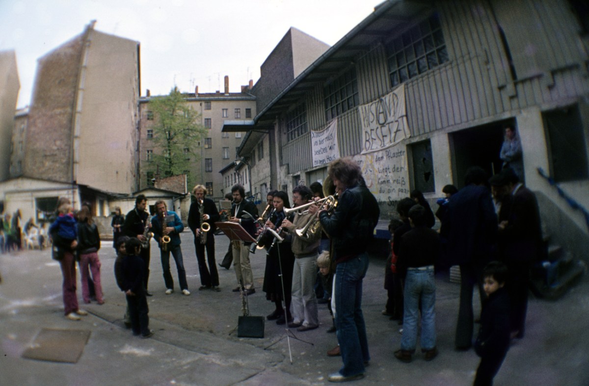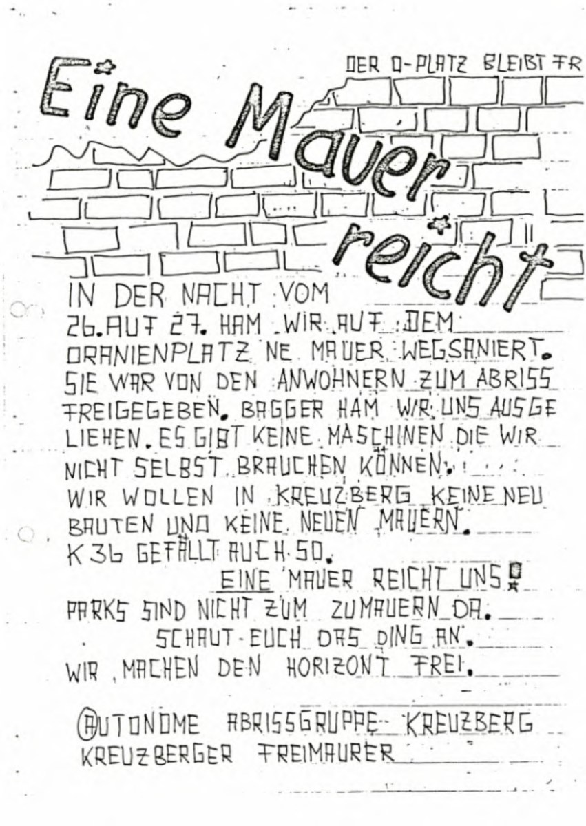 Bevor alles in die gefeierte Einbeziehung der Anwohner:innen mündete, brauchte es diese Aktion: Auf dem Oranienplatz wird eine vom Bezirksamt gerade erst errichtete Mauer, die vielen Anwohner:innen sinnlos erscheint, niedergerissen. In einem Handgemenge zieht ein Polizist eine Waffe. Ein Beteiligter schlägt daraufhin den Beamten mit einem Knüppel eins über und wird verhaftet. (Das Urteil wird am 27.01.81 verhängt: zweieinhalb Jahre).