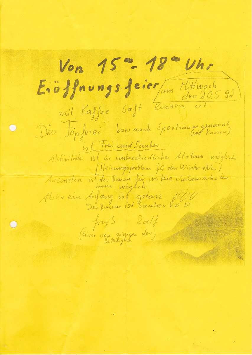 Doch das, was wir von ihm wussten, war aufregend genug. Als 25-jähriger begann er als Erzieher in der Kita zu arbeiten. Bis er eine Auszeit brauchte, die führte ihn nach Skandinavien. Als er nach einem Jahr zurückkehrte, wollte er nicht mehr in die Erzieherroutine zurück. Er wollte kreativ arbeiten, ohne sich dem Korsett einer Vorschulbildung zu unterwerfen. So wurde er Besetzer bei Besetzers. Ganz hinten, wo heute die Kantine residiert, war Leerstand. Denn wir hatten bis dahin keine Möglichkeit gehabt, die Räume herzurichten. Ralf waren sie so, wie waren gerade richtig. Er besorgte einen großen Tisch, einen Brennofen und jede Menge Ton. Und so konnte es losgehen. Die Kinder kamen gerne und es ist nicht einzuschätzen, wie viele Aschenbecher dort produziert wurden.