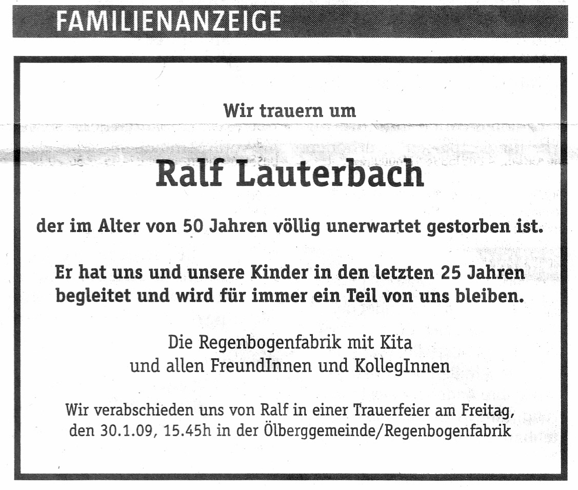 Im Dezember 2008 verabschiedete er sich in den Urlaub, am 6. Januar wurde er wieder erwartet. Als er nicht kam, sich nicht meldete, war den Kolleg:innen gleich klar, dass da etwas nicht stimmt. Niemals wäre Ralf so kommentarlos weggeblieben. Sie alarmierten die Feuerwehr, die ihn in seiner Wohnung fand. So ist er aus dem Leben gegangen